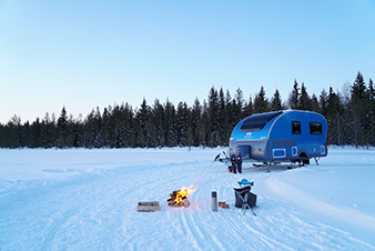 As if to feed the Aurora dream, the display is never guaranteed. The Lights will only come out to play on their own terms. You can improve your chances of capturing The Aurora by selecting a remote location in the Arctic Circle that offers dark skies, far away from the light pollution of towns and cities. Choose a night when clear skies are forecast, and check that the moon will not be too large or bright. Apukka Resort in Finland opened its doors for the first time in December 2017, offering guests a variety of unique Aurora-centric experiences. One such experience for one or two people is a peaceful night alone in the wilderness enveloped in the warmth and luxury of a very special ‘Aurora Wagon’. What is an Aurora Wagon? It is based on the wonderfully cute Adria Action. Action’s unmissable shape and gorgeous curves make it a modern style classic. Funky design, luxury specification, solid quality, superb insulation, and, of course, that fabulously huge roof window, all combine to make this caravan the perfect choice for the Apukka Rezsort.