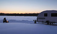 Converting the Action into an Aurora Wagon involved wrapping the caravan in Apukka-themed branding, then replacing the wheels with skis. Basically, an Aurora Wagon is an Adria Action on skis. Me, I have always been a huge fan of the Action. I love good design, but only when it is matched with useable practicality. Ten years ago I spent the entire summer touring in a 361LH, and now we see this classic reimagined. It was in Düsseldorf that I first met the Action 391PD, and it was Love at First Sight. ‘Love the New Original’ invited the publicity. Love it I did. So imagine my delight when I was offered the opportunity to chase my dreams, visit the Apukka Resort in Finland, and spend a night in an Aurora Wagon based on the Action 391PD. After a warm welcome at the intimate resort, the friendly and enthusiastic Mikko coupled up my Aurora Wagon to his snowmobile and we headed off into the forest wilderness. Soon I was alone in the Aurora Wagon enjoying the hot berry juice and snacks left by Apukka. In order to keep things simple, cooking is not permitted in the Aurora Wagon and the water tanks