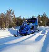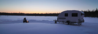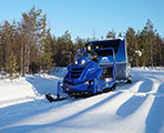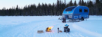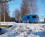 La conversione di Action in "Aurora Wagon" ha visto l'aggiunta di un caravan a marchio Apukka e quindi la sostituzione delle ruote con degli sci. Fondamentalmente, un "Aurora Wagon" è un Adria Action su sci. Io sono sempre stato un grande fan del modello Action. Amo il buon design, ma solo quando è abbinato a una praticità effettiva. Dieci anni fa ho passato l'intera estate a viaggiare in un 361 LH, e ora vediamo questo classico riveduto. Ho incontrato il primo Action 391 PD a Düsseldorf ed è stato amore a prima vista. "Ama il nuovo originale", diceva la pubblicità. E io me ne sono innamorato. Potrai quindi immaginare la mia gioia quando, visitando l'Apukka Resort in Finlandia, ho potuto trascorrere una notte in un "Aurora Wagon" basato su un Action 391 PD. Dopo un caloroso benvenuto presso il resort intimo, l'amichevole ed entusiasta Mikko ha accoppiato il mio "Aurora Wagon" alla sua motoslitta e ci siamo diretti nella foresta selvaggia. Ben presto mi sono ritrovato da solo nel "Aurora Wagon" a godermi un succo di bacche caldo e snack offerti da Apukka.