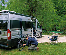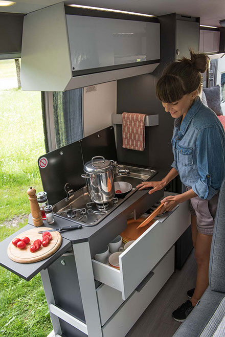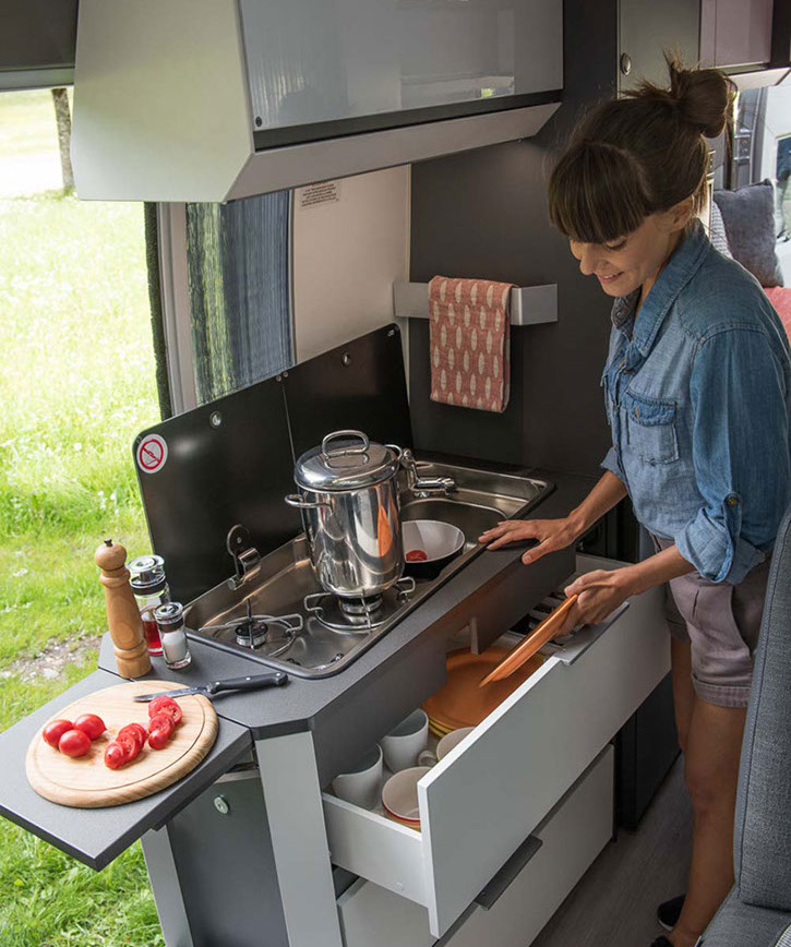 Bedrooms are located at the rear of course, all with comfortable matrasses and all are generously proportioned, in long or fixed bed formats, all with new storage solutions and extra privacy. We had plenty of space for our bikes, and gear and managed two great night’s sleep. In the new SGX model, for those with more hard-core gear than us, there's an electrical pull-down bed allows sleeping at different heights and positions and really maximises storage, even for a motorcycle.