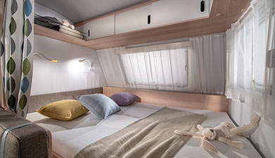 Adria has upgraded the interior with a new combination of wood finishes and white cupboard colours and the upgraded lighting system, which brings a new ambiance, an even more elegant feeling inside. A choice of 4 textile combinations with 6 different soft furnishings, means plenty of opportunity to make Aviva, really yours