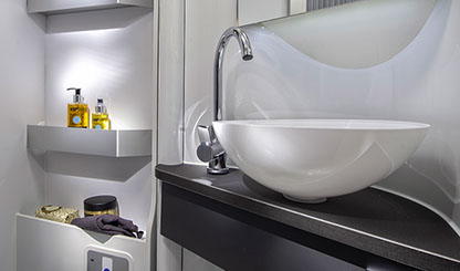 Der neue 600 SL Grundriss in den Plus und Axess Modellen bietet die neue Duplex-Badezimmerlösung an, mit der Schwenkwand für mehr Wohnraum und separater Duschzelle.