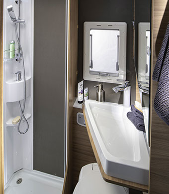 ADRIA WOHNMOBILE BIETEN AUCH EINE PALETTE VON TRADITIONELLEN BADEZIMMERN, EINSCHLIESSLICH EN-SUITE UND SEPARATER DUSCHE, ABHÄNGIG VOM GRUNDRISS.