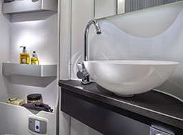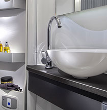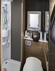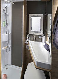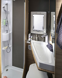 ADRIA WOHNMOBILE BIETEN AUCH EINE PALETTE VON TRADITIONELLEN BADEZIMMERN, EINSCHLIESSLICH EN-SUITE UND SEPARATER DUSCHE, ABHÄNGIG VOM GRUNDRISS.