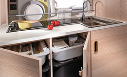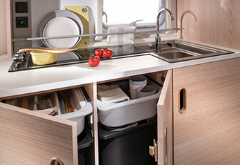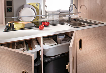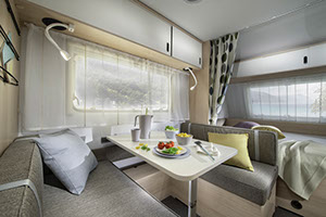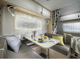 Adria has upgraded the interior with a new combination of wood finishes and white cupboard colours and the upgraded lighting system, which brings a new ambiance, an even more elegant feeling inside. A choice of 4 textile combinations with 6 different soft furnishings, means plenty of opportunity to make Aviva, really yours