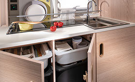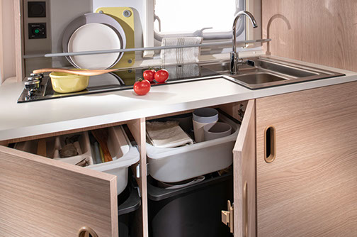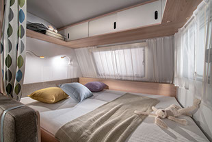 There’s practical touches everywhere you look, from the ample storage places to the loudspeakers, pre-installation for Bluetooth amplifier and USB sockets. There’s some neat touches with Vanity Pack to go features and a Kid’s Play Set on two models as a nice optional feature. Heating is by Truma as an option, with Trumavent and floor heating on bigger layouts.