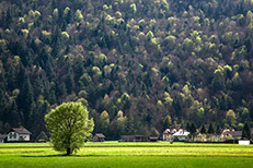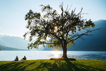 The famous tree at Lake Bohinj in summer, a popular place for relaxing and watching the sunset behind the Julian Alps.