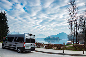 View across Lake Bled to the island church from outside Zaka Campsite.