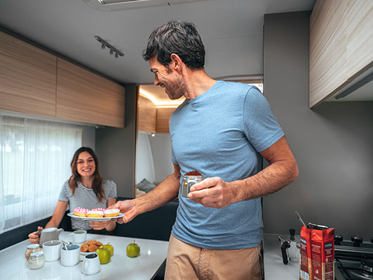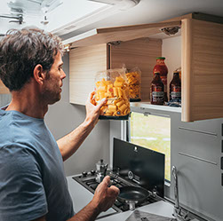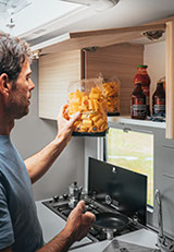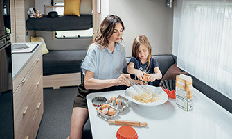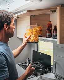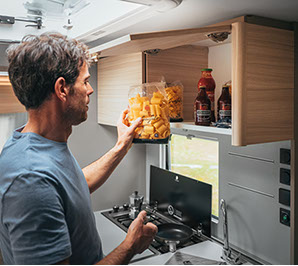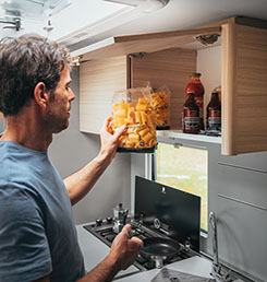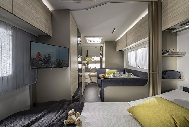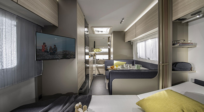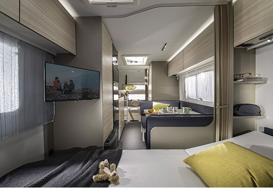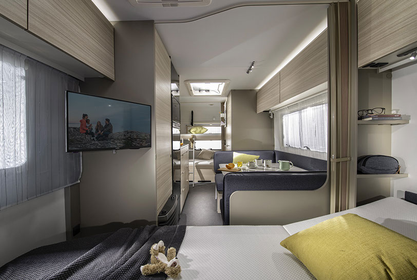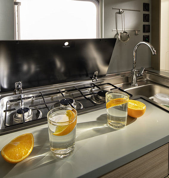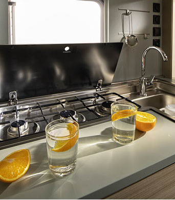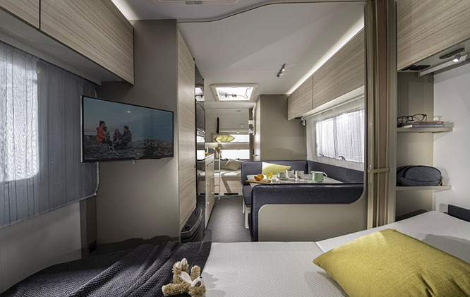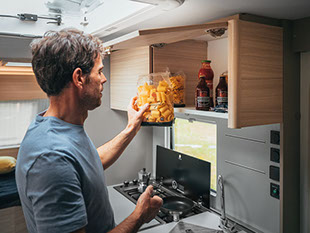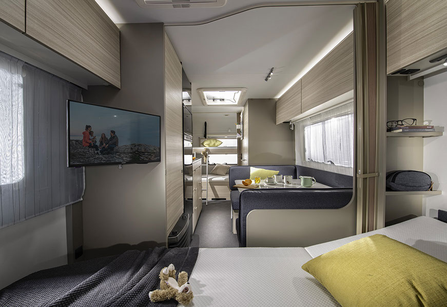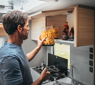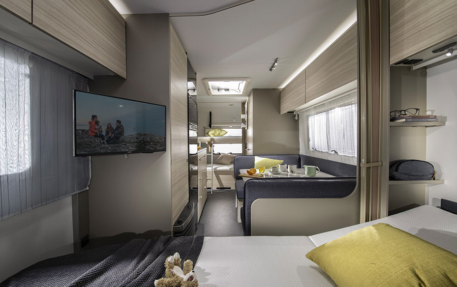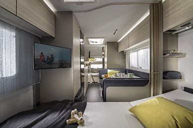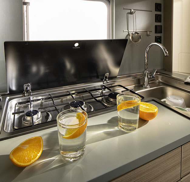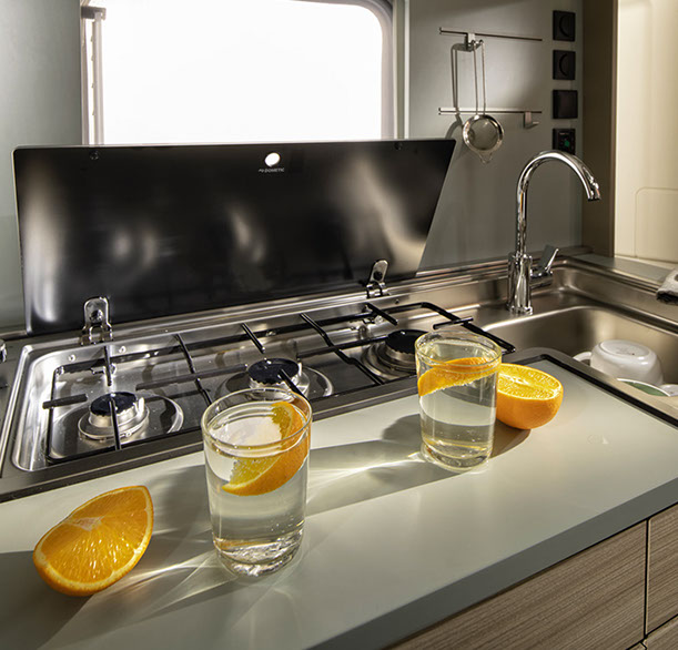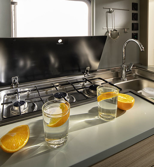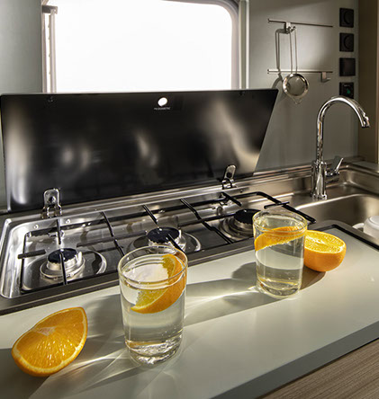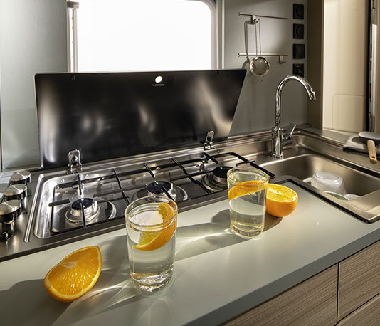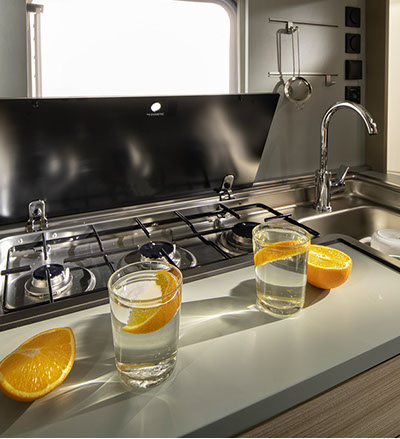 “ALTEA 472KP. UN LAYOUT DINAMICO E INNOVATIVO CON LA NUOVA CUCINA MODULARE CHE ASSICURA LIBERTÀ E SPAZIO PER RIPORRE TUTTO IL NECESSARIO; UN MODELLO A SCOMPARSA ESCLUSIVO DI ADRIA, PERFETTO PER LA VITA ALL’ARIA APERTA.