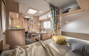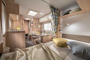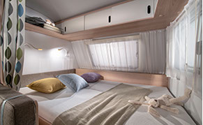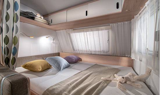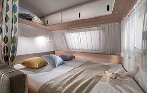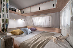 Na voljo je devet tlorisov, po katerih lahko v prikolici udobno spi od dva do šest ljudi, in sicer na vseh vrstah postelj, tudi na pogradih.